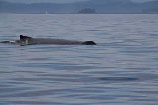 11:30 am till around 2 pm Humpback Whale circling the "Golden Triangle", as we call it up here, between Donagal Head on Malcolm Island, Bold Head on Swanson Island, and the Plumper Islands. This area is all at the top West end of Blackfish Sound. This HB is a new one to the area and is numbered BCX0097 now named "Butterfly" due to a mark on it’s tail flukes. He/she spent time resting on the surface, doing 10 minute dives, trumpeting when being bothered by the dolphins, and quickly doing a deep, long dive to get out of the way of the Resident Orca and Pacific White Sided Dolphins.