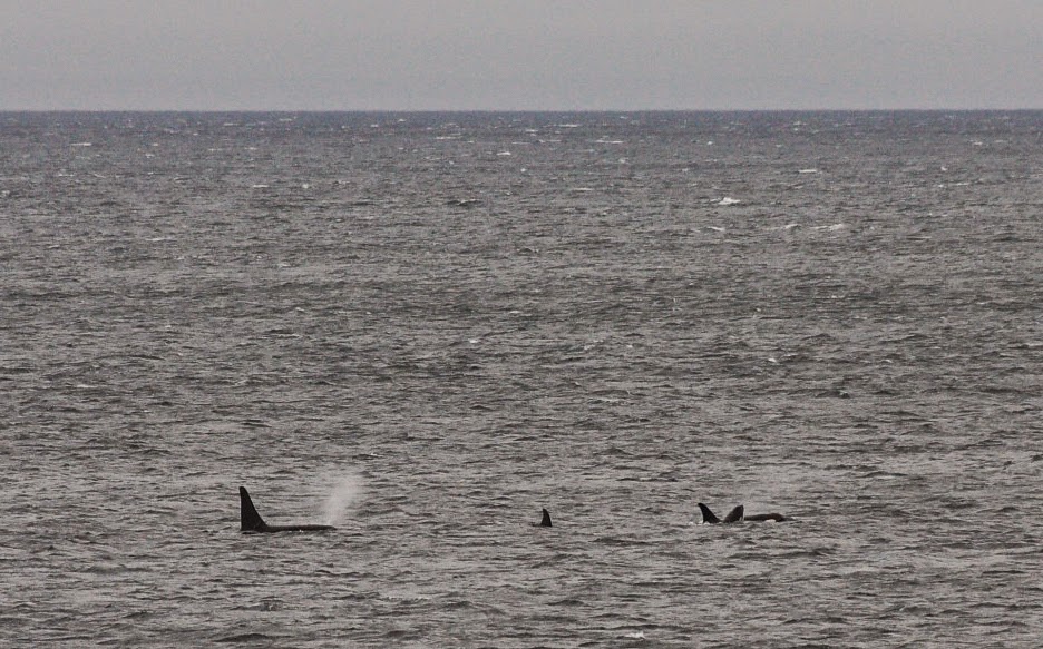 11:45 am: There are whales (Orca) out in front of the Beacon B and B, in Powell River. There is one large dorsal fin and a baby whale.