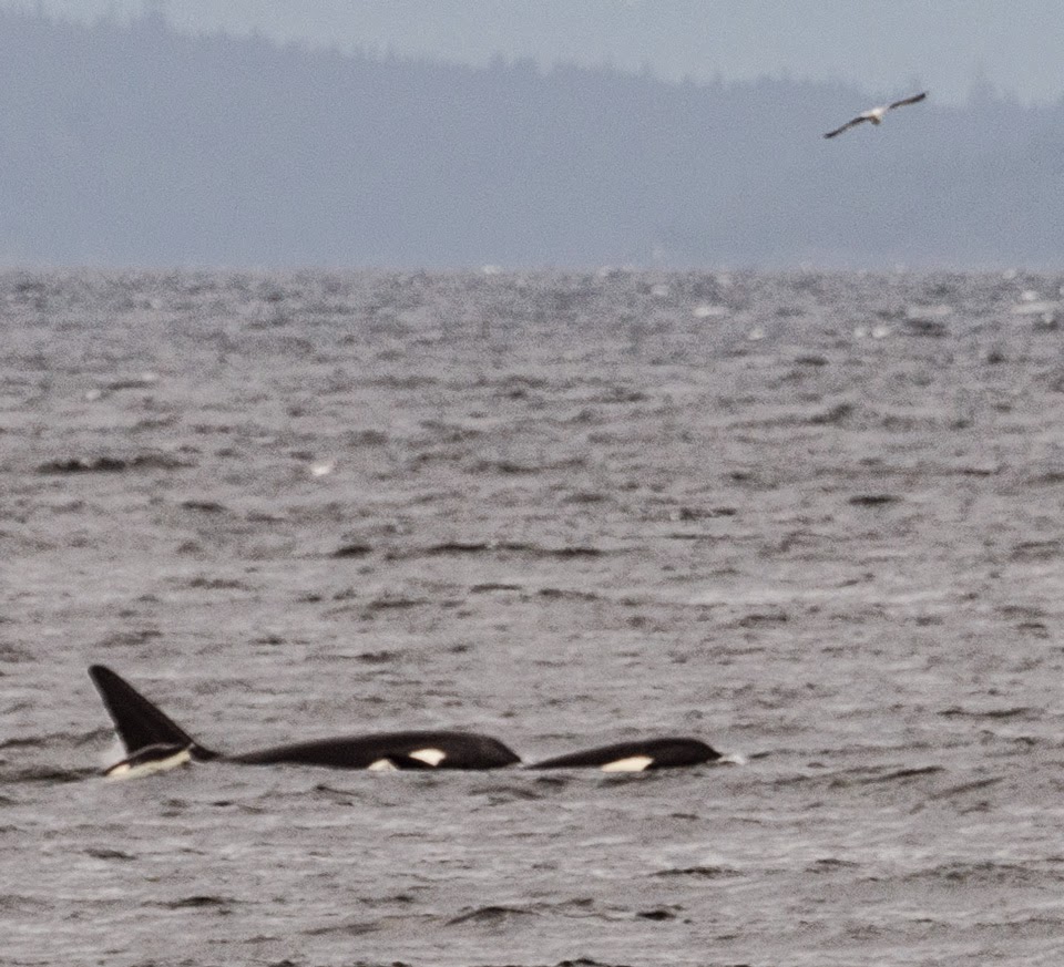 3:00 pm: 3 Orca westing past Camp Point, all females, one calf. Correction, there are four Orca, maybe one big fin.
