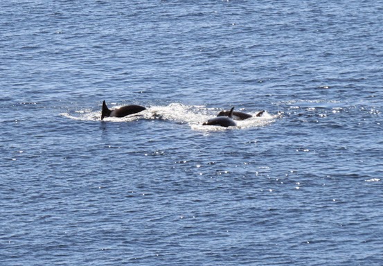 8:30 am The Orca were jumping out of the water and landing on the poor sea lion. I bet it hurts!! I think they’re teaching the young ones. There’s one big male for sure.