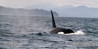 3:13 pm: "K.C" is in major zig zag mode. One dive at April Point. Next puff and he is across the channel at Orange Point still north bound. Am leaving him now.