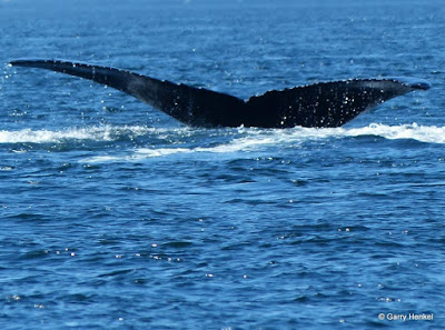 3:34 pm: The main group are now out of sight around the tip of Harwood Island. As I continued to watch, I spotted a large Humpback Whale fluke as it dove, also heading Northwest.
