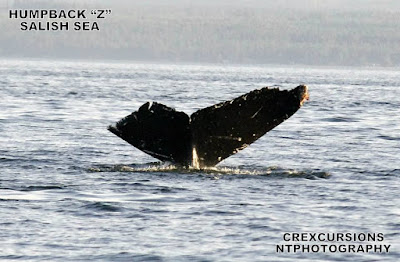 3:35 pm As I continued to watch for more of J-Pod, I spotted a large Humpback Whale fluke as it dove, also heading Northwest.